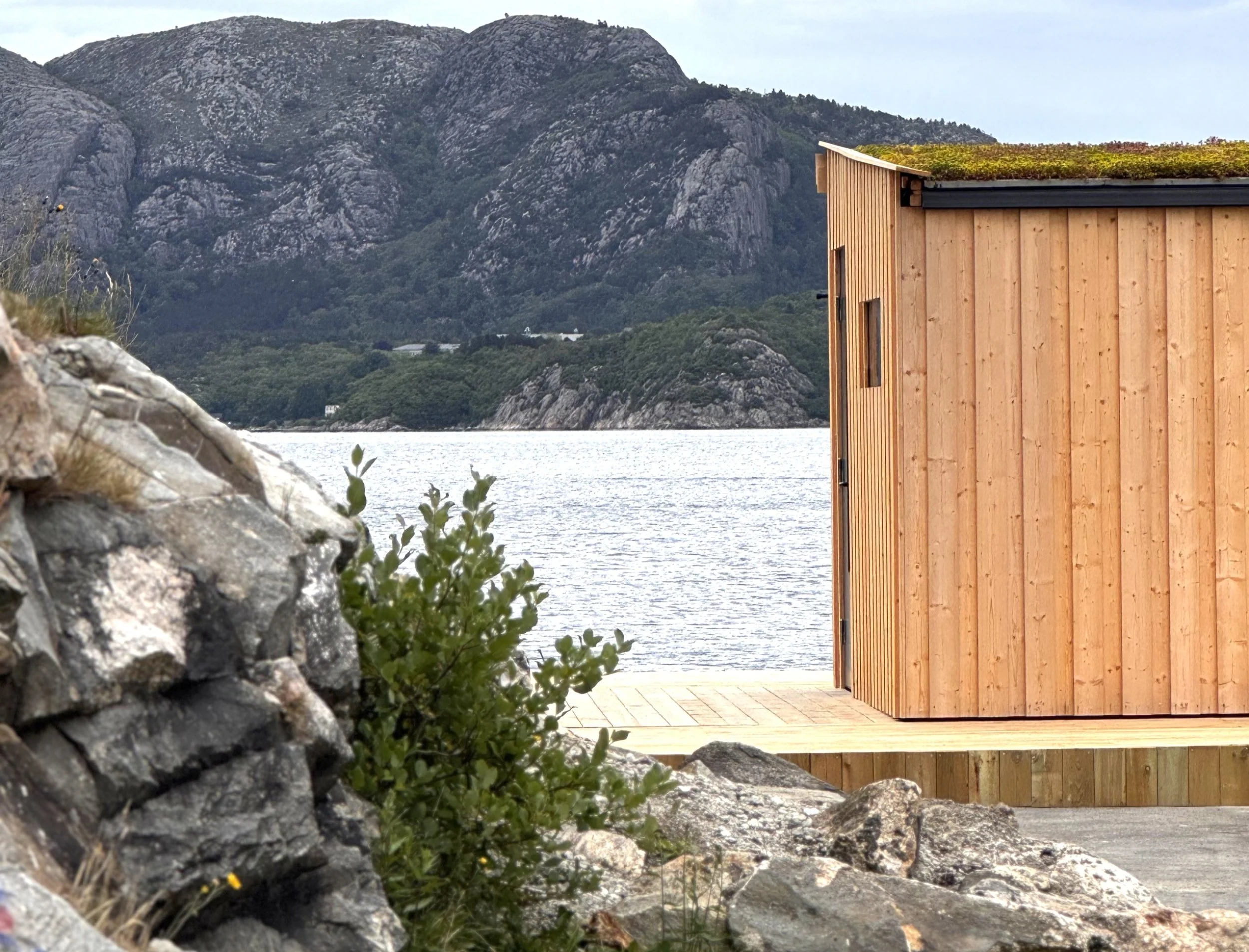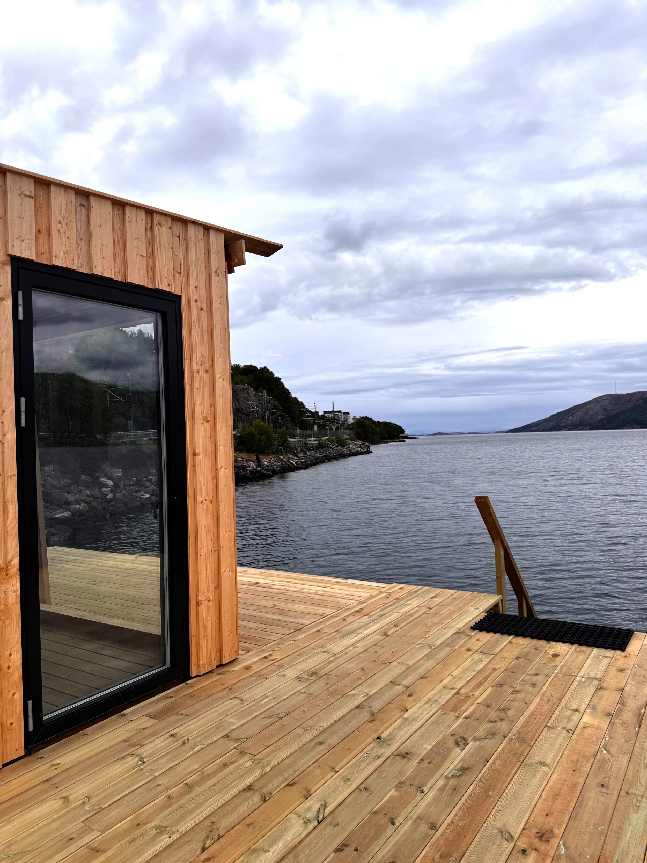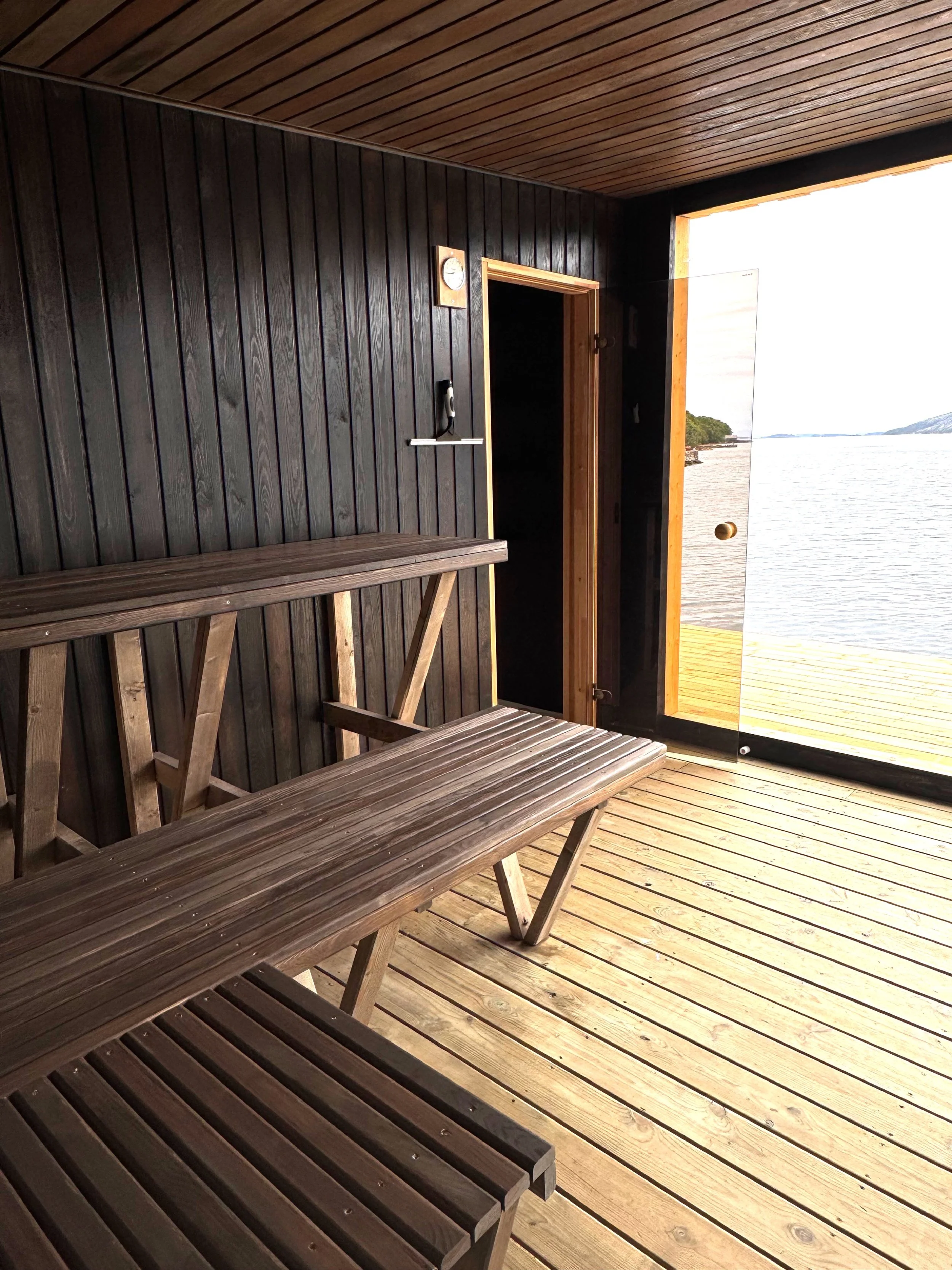 Termotre, god og romslig garderobe. Sauna på sjøen med plass til opptil 10 personer på nydelige Lurastø med utsikt mot fjellene i gandsfjorden.